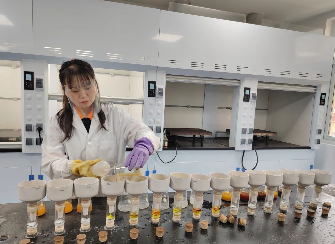 ▲技术质量监督部化验工 开展金化验工作,用活性炭吸附矿样中的金